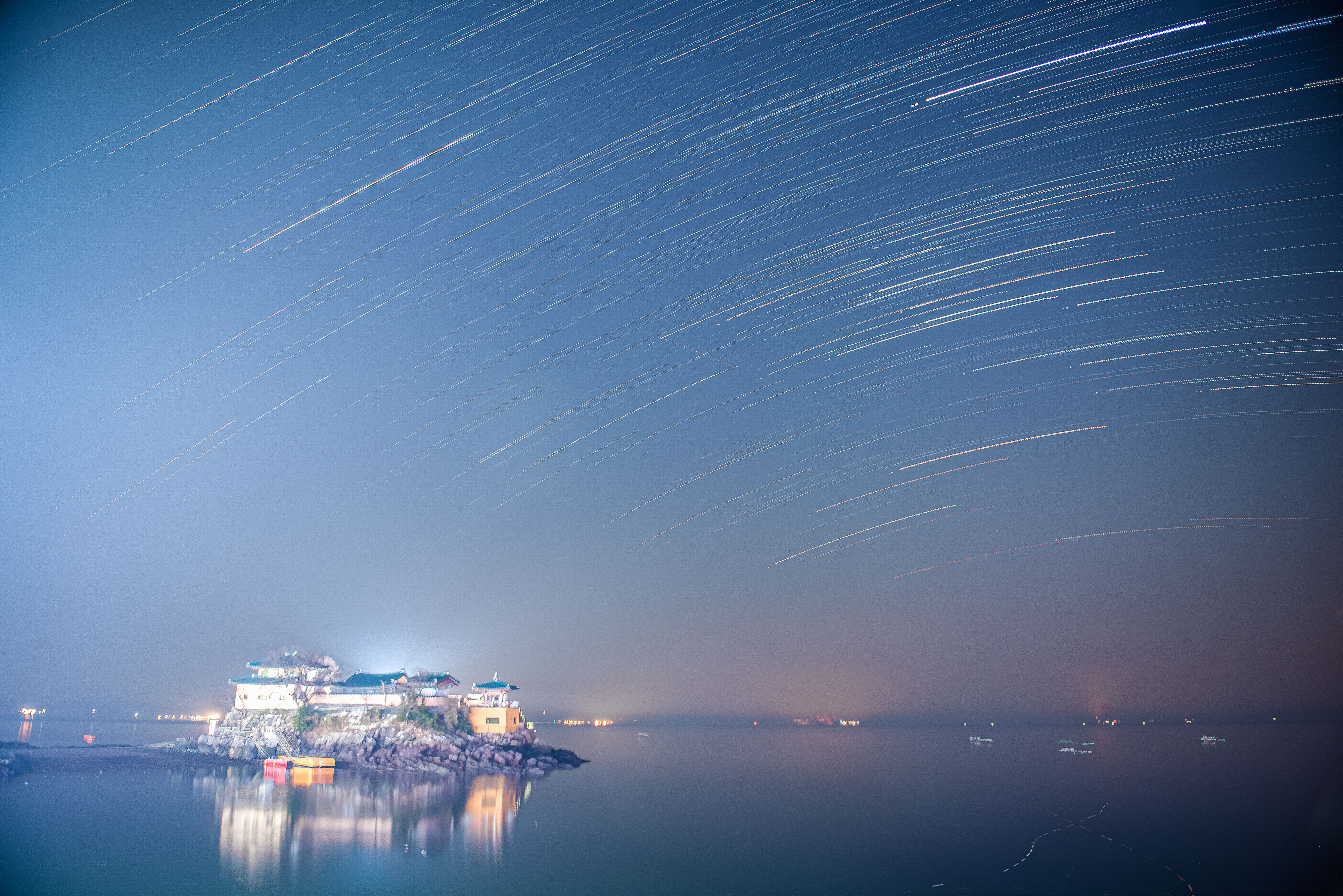 긴 밤이 지루하여 1시간 별 궤적을 담아 보았지만 연무인지,미세먼지인지 뿌연 하늘로 제대로 담지못하였다.