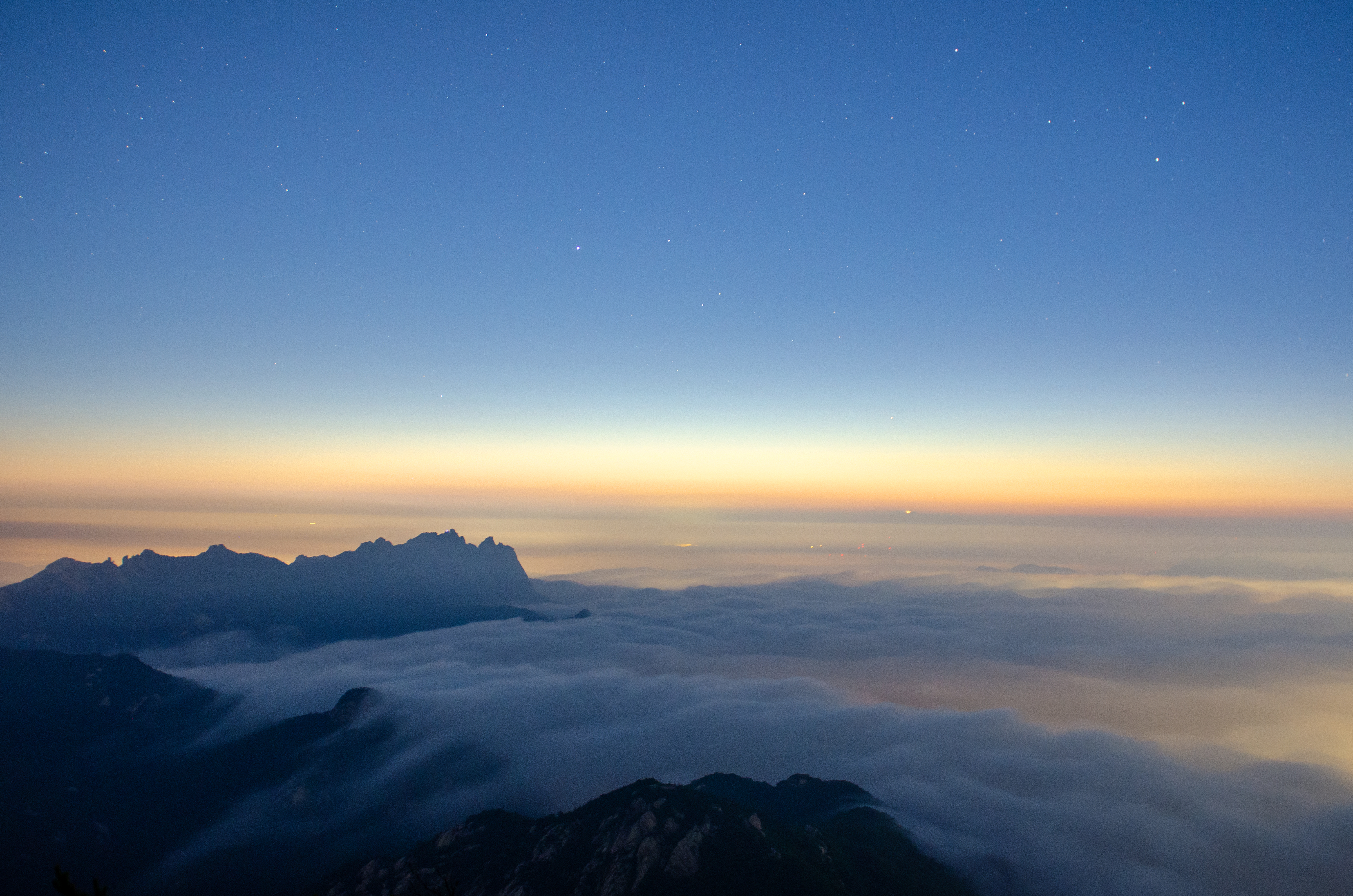 르며 하늘을 올려다 보아도 흐리진 않았으나 별은 많이 보이지 않았으나 02:20'경 만경대에 올라서 바라본 하늘은 생각보다 별궤적을 담기에 여건은 좋아 카메라 1대는 바로 설치하여 별 궤적을 담고 다른 한대로 야경을 담으며 운해가 밀려 오기를 기다렸다.