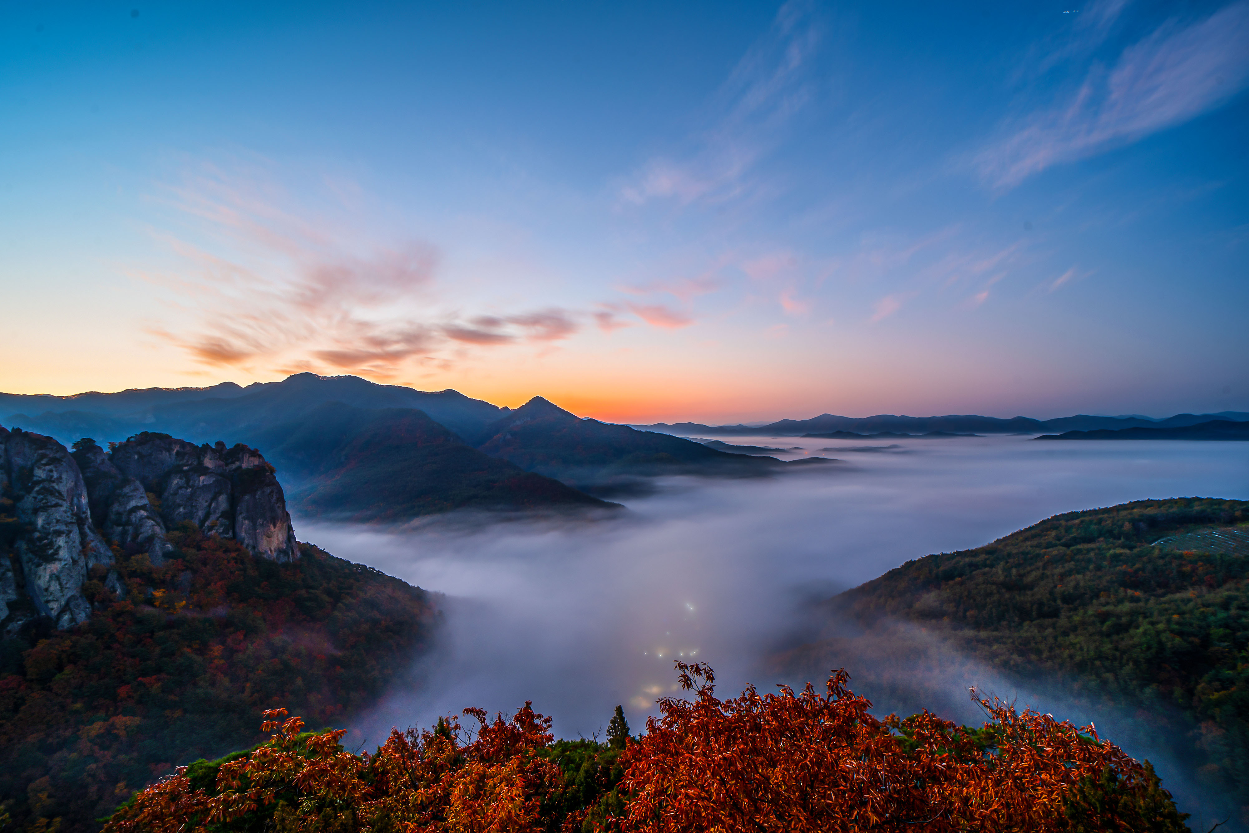 주왕산 단풍이 들면 장군봉에서 멋진 운해와 단풍을 담겠다고 벼루다 예보상 여건이 좋아 밤 12시에 잠못자고 달려가 05시경 포인트에 오르니 아직 여명이 밝아 오는 시간도 아닌데 좋은 포인트에는 다섯명에 사진가 들이 삼각대 펼쳐 놓고 기다리고 있다 비탈진 곳에 겨우 삼각대 펴고 먼저 온 분들과 애기하다 보니 대구에서 오신 강 0 ㅎ 작가님이 오셨다 3년전 그분