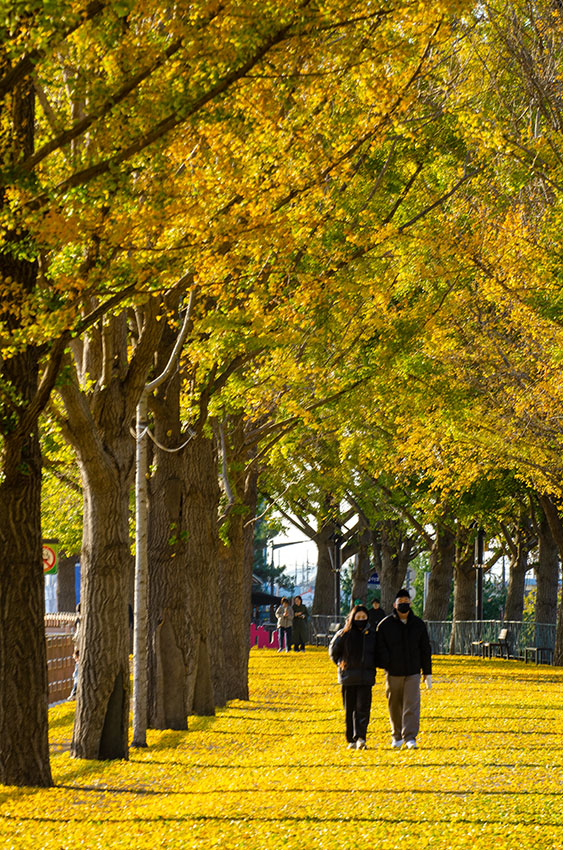 전국 은행나무길이 여러 군데 있지만 이곳 아산 곡교천 은행나무길이 제일 길고 잘 조성 관리 되고 있어서 은행나무 단풍이 절정일때는 많은 탐방객들이 몰리는 곳인데 금년 이곳 단풍이 이쁘지 않다 알려져서 일까 탐방객들은 많지 않았다. 하필이면 단풍이 곱게 물들 시기에 갑자기 추위가 닥치고 또 바람까지 많이 불어서 은행나무 잎이 물들기도전에 잎이 많이 떨어졌고 지금 남아 있는 잎도 제대로 샛노란 색으로 물들지 않고 가까이에서 자세히 보면 타들어 가는 색으로 금년에는 이곳 방문을 권하고 싶지 않다.